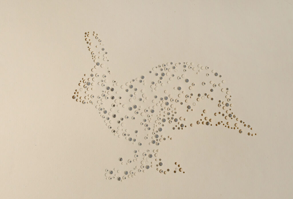 Estas piezas, realizadas con papeles y fibras del territorio y técnicas de calado, perforación y marcas de agua,capturan esa dualidad, revelando la belleza y vulnerabilidad de estas especies. presentan a la liebre como símbolo de resiliencia y vínculo íntimo con su entorno natural.