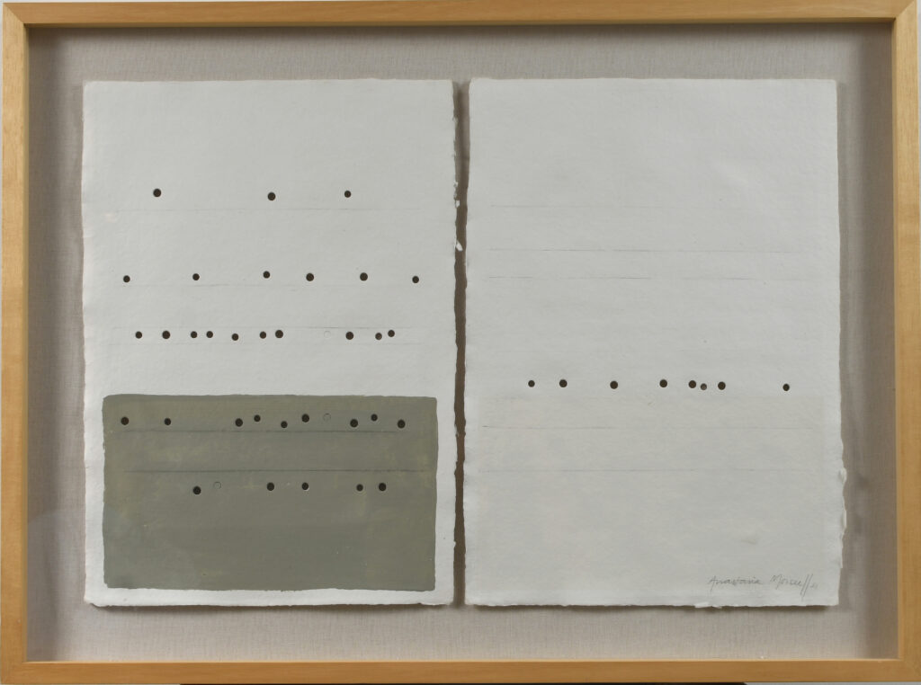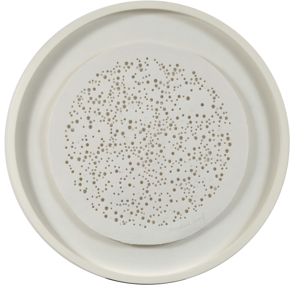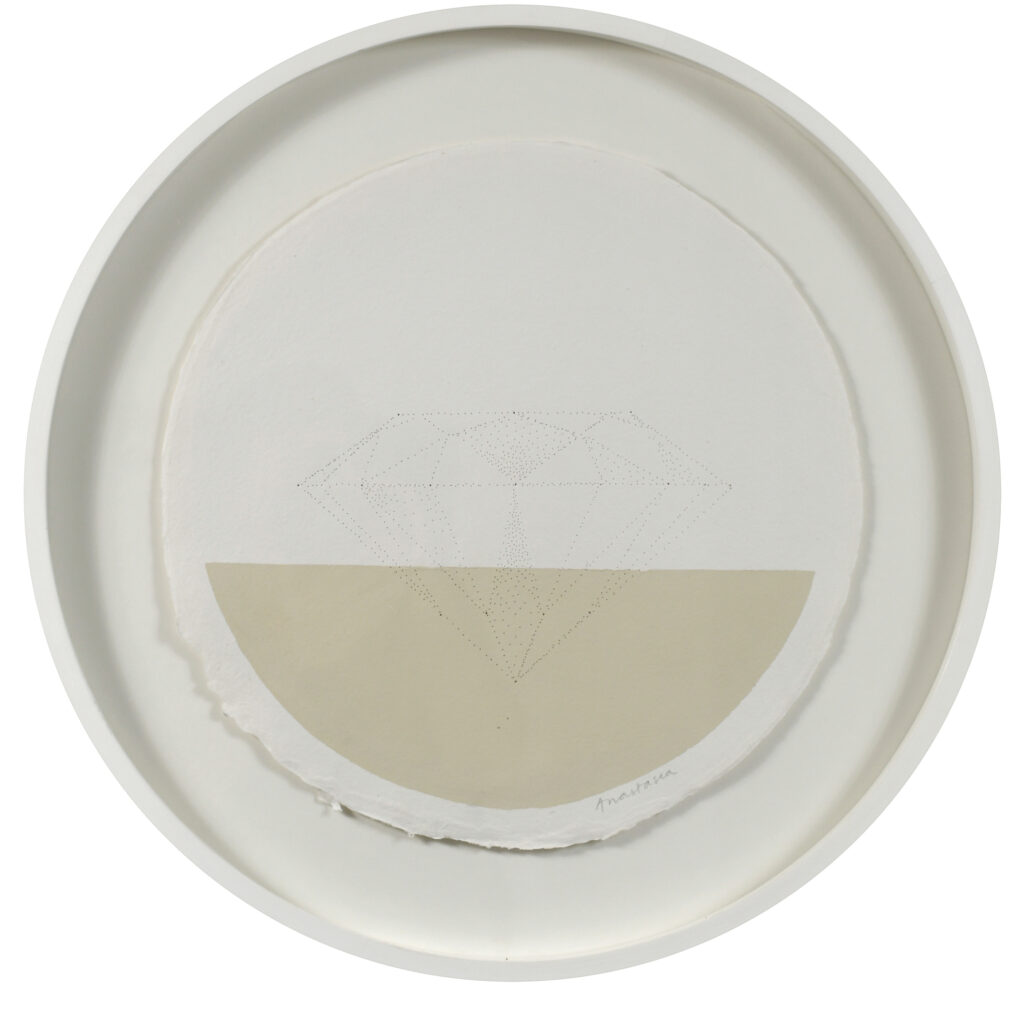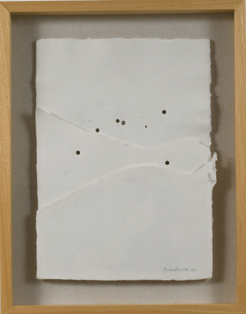 Esta serie está realizada en papel hecho y calado a mano, algunas veces intervenida con pigmentos naturales o dibujo, y cosida con hilo común o de biomateriales. El trabajo minucioso une fragmentos para integrar nuevos mundos y generar universos posibles. La obra explora la capacidad de conectar realidades diversas y propone una forma de exploración conceptual desde el gesto y la materia.