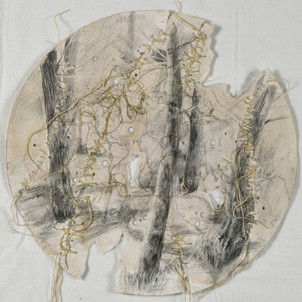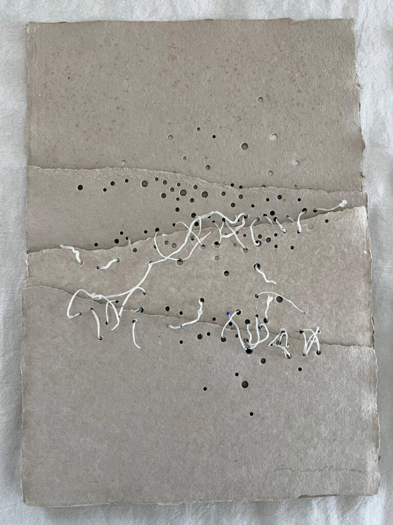 Handmade paper, drawing with black water-soluble pencils, hand-cut and stitched