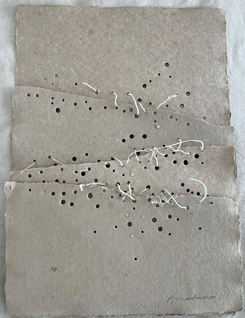 Papel hecho a mano, calado y cosido con hilo de biomaterial