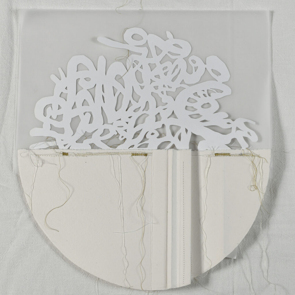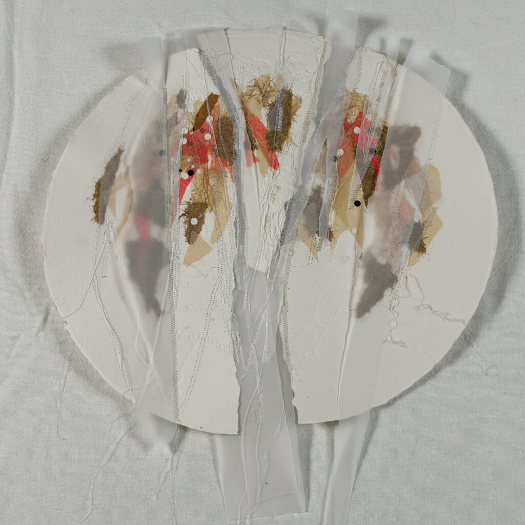 Handmade paper, tracing paper, collage, and thread stitching