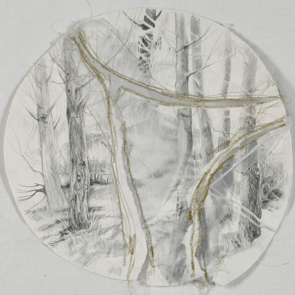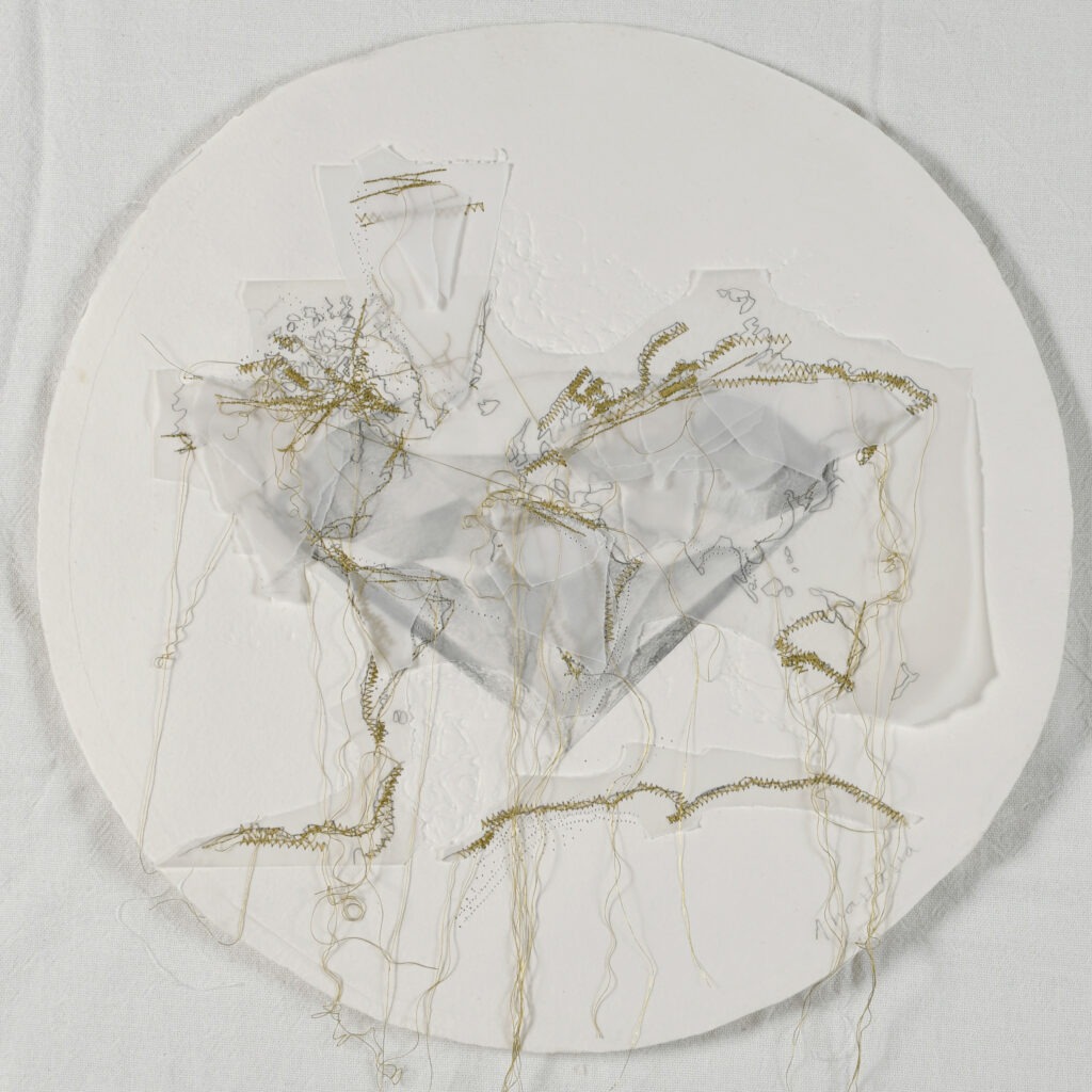 Dibujo sobre papel hecho a mano y papel calco, cosido con hilos blancos y dorados